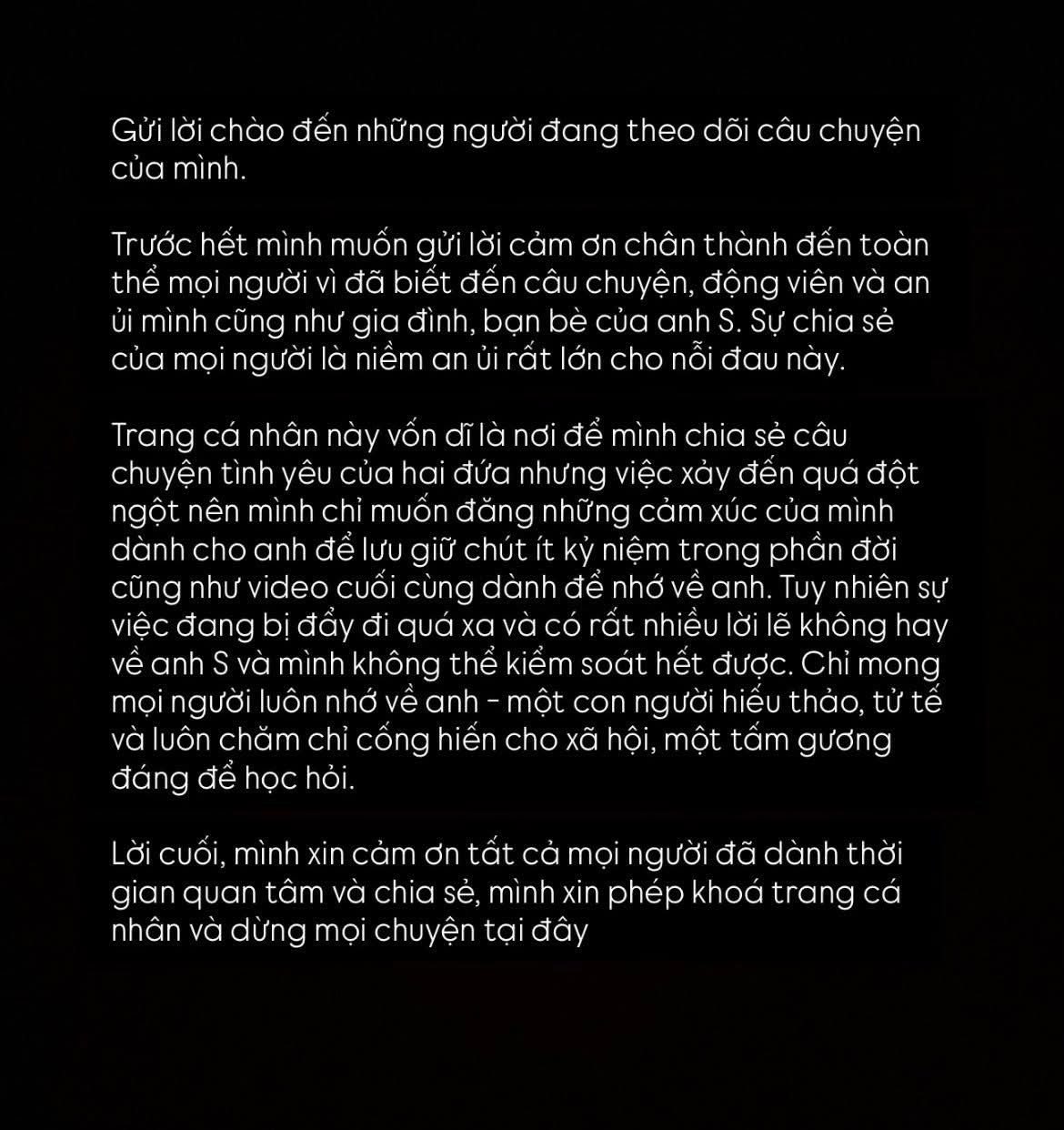 Mình đã làm video ấy vào tối hôm qua, khi đang trên đường trở về nhà, vừa làm mà vừa khóc. Mình nghĩ chắc mọi người sẽ hiểu được lòng mình lúc này. Bản thân mình còn đang không biết phải sống tiếp ra sao khi không còn anh ấy bên cạnh…”.