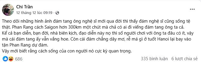 Trong đó, có nhiều người đặt câu hỏi vì sao một diễn viên đã từng đoạt đến sáu huy chương vàng, đóng hơn 200 bộ phim, vở kịch nhưng khi qua đời, không thấy các hội nghề nghiệp như Hội Điện ảnh, Hội Sân khấu gửi vòng hoa hoặc một dòng tin nhắn chia buồn.