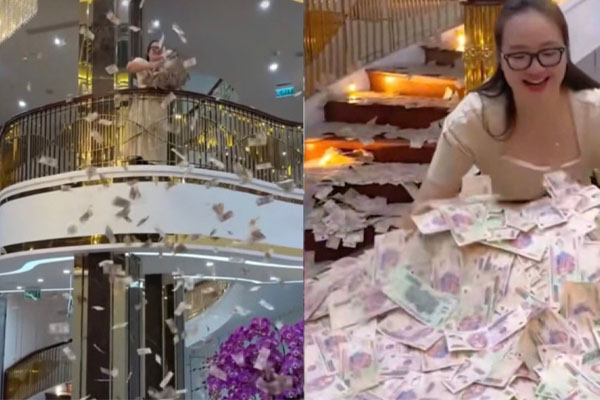 Trong đoạn clip được đăng tải, Hoàng Hường vừa đi vừa ném tiền từ trên cầu thang xuống rồi tung lên không trung. Đáng nói, dưới sàn nhà rất nhiều tờ tiền các mệnh giá cũng được rải sẵn, khi nữ đại gia này đi từ trên cầu thang xuống đã trực tiếp giẫm lên rồi tiếp tục ném tiền khắp sàn.