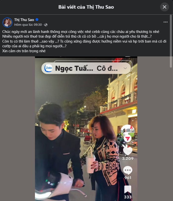 Cô dâu Thu Sao lên tiếng sau khi bị chỉ trích vì thuê trai trẻ đi chơi như người yêu để trả th:ù chồng cũ