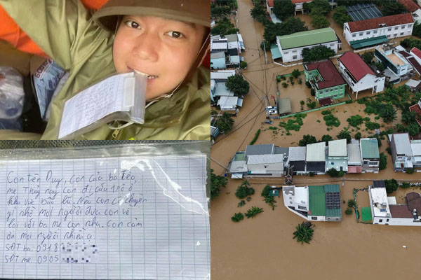 Trước đó, mạng xã hội lan truyền tờ giấy nhắn đầy xúc động do Bảo Duy tự viết trước khi đi vào vùng bão lũ. Mẩu giấy được anh cẩn thận bọc kín chống nước, luôn mang theo bên mình trong quá trình làm nhiệm vụ. Duy ghi rõ họ tên, quê quán và lời nhắn nhờ mọi người giúp đưa anh về với gia đình nếu chẳng may xảy ra chuyện ngoài ý muốn: “Con tên Duy, con của ba Tèo, mẹ Thủy. Nay con đi cứu trợ ở khu vực bão lũ. Nếu con có chuyện gì, nhờ mọi người đưa con về lại với ba mẹ con nha. Con cảm ơn mọi người nhiều ạ”.