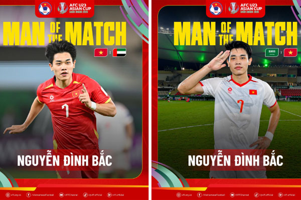 Đáng nói hơn, đây không phải lần đầu Đình Bắc được xướng tên ở hạng mục MVP. Trận cuối vòng bảng, Đình Bắc cũng là Cầu thủ xuất sắc nhất, giúp U23 Việt Nam hạ chủ nhà Ả Rập Xê Út để giành vé vào tứ kết.