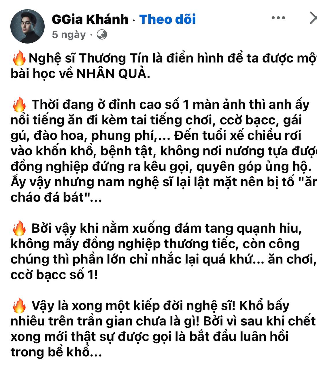 “Nữ hoàng ảnh lịch” Diễm My, người từng có thời gian gắn bó với Thương Tín, chia sẻ: “Đời người hữu hạn và luôn có những cuộc chia ly mà ta không bao giờ sẵn sàng. Cuộc đời anh Thương Tín đi qua nhiều đoạn thăng trầm, nhưng cũng từng tỏa sáng như một ngôi sao, món quà quý giá nhất đối với người làm nghệ thuật.