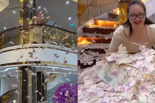 Hoàng Hường gây tranh cãi với hành động ném tiền từ trên cao xuống dưới đất