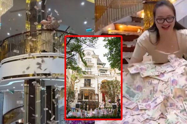 Theo đoạn clip được đăng tải, Hoàng Hường vừa đi trên chiếc cầu thang 5 tỷ xuống vừa ném tiền rồi tung lên không trung. Sau đó Hường trực tiếp giẫm lên rồi tiếp tục ném tiền khắp sàn.