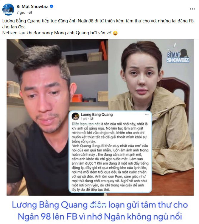 Trong video dài hơn 10 phút, Lương Bằng Quang nhiều lần nghẹn ngào, lau nước mắt. Anh chia sẻ: “Đáng ra người ngồi đây nói với khán giả hôm nay là vợ tôi, nhưng có lẽ cô ấy đã linh cảm trước điều gì đó nên đã viết lại đôi dòng để tôi thay cô ấy gửi đi”. Theo Lương Bằng Quang, bức thư được Ngân 98 viết vài ngày trước khi cô bị bắt.