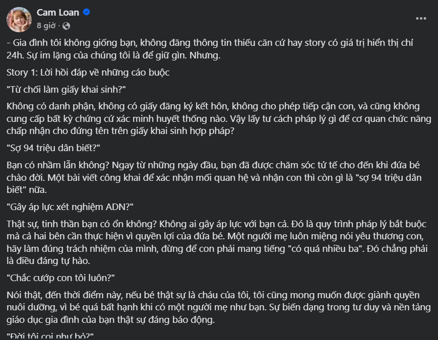 Nội dung mà người ta đăng không giống như bạn nói đâu. Bạn đăng những thứ sờ sờ trên mạng xã hội, cả cộng đồng mạng đều biết, thì làm sao có thể cắt ghép được? Muốn nhận con, chúng tôi phải liên hệ với người đang nuôi dưỡng bé? Bạn ở đâu mà cơ quan chức năng tìm còn trầy trật, thì tôi tìm bạn bằng cách nào? Lúc thì bạn lên mạng nói “bỏ con”, lúc lại bảo “không có ba, không có bà nội”, vậy chúng tôi lấy tư cách gì để liên lạc với bạn? Rồi lỡ khi tìm đến gặp được con bé, chúng tôi lại bị mẹ bạn hăm “con *** xuống đây tao nhấn đầu nó xuống mương” thì sao? Ra tòa là cách duy nhất và đúng trình tự pháp lý.