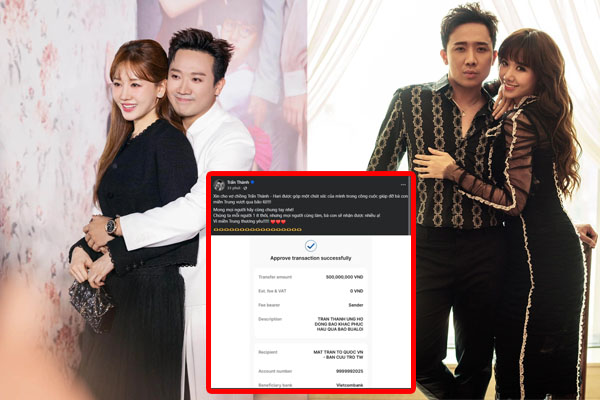 Trên trang cá nhân, Trấn Thành đăng ảnh chụp chuyển khoản kèm chú thích: “Xin cho vợ chồng Trấn Thành – Hari được góp một chút sức của mình trong công cuộc giúp đỡ bà con miền Trung vượt qua bão lũ!!!! Mong mọi người hãy cùng chung tay nhé! Chúng ta mỗi người 1 ít thôi, nhưng mọi người cùng làm, bà con sẽ nhận được nhiều ạ! Vì miền Trung thương yêu!!!!!”.