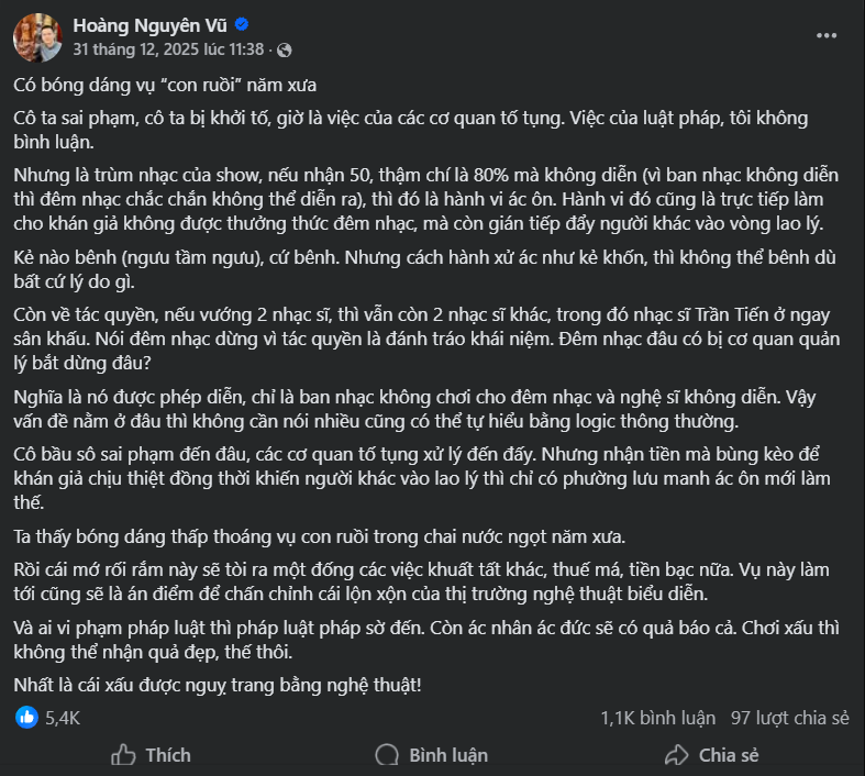 Nhưng là trùm nhạc của show, nếu nhận 50, thậm chí là 80% mà không diễn (vì ban nhạc không diễn thì đêm nhạc chắc chắn không thể diễn ra), thì đó là hành vi ác ôn. Hành vi đó cũng là trực tiếp làm cho khán giả không được thưởng thức đêm nhạc, mà còn gián tiếp đẩy người khác vào vòng lao lý.