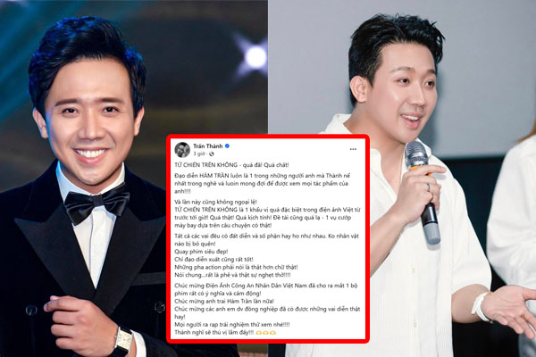 Cụ thể, nam diễn viên viết: “Đạo diễn Hàm Trần luôn là một trong những người anh mà Thành nể nhất trong nghề, và luôn mong đợi để được xem mọi tác phẩm của anh. Tử chiến trên không là một khẩu vị đặc biệt trong điện ảnh Việt từ trước tới giờ, quá thật, quá kịch tính. Đề tài cũng lạ, một vụ cướp máy bay dựa trên câu chuyện có thật”, Trấn Thành viết.
