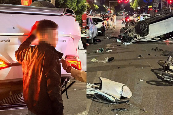 Tiếp đó, chiếc Lexus RX350 lao sang làn ngược chiều rồi tông liên tiếp vào 4 ô tô và 1 xe máy đang dừng chờ đèn đỏ. Tại hiện trường, ô tô Lexus nằm ngửa bụng trên đường, phần đầu và đuôi xe biến dạng, mảnh vỡ văng tung tóe, các ô tô khác hư hỏng nhẹ, xe máy biến dạng.