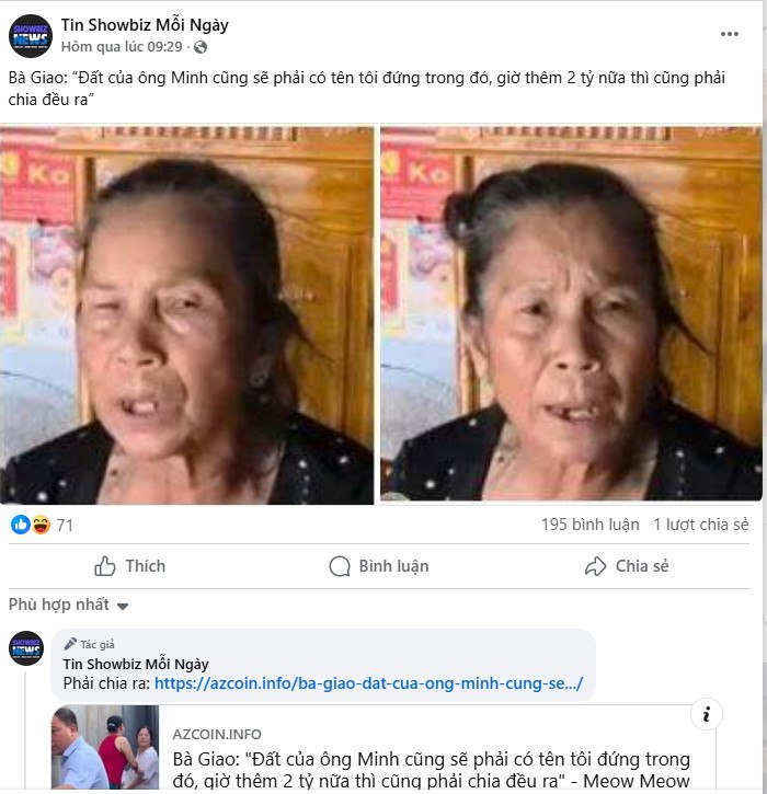 Fanpage Tin Showbiz mỗi ngày đăng tải thông tin cô Giao đòi hưởng số tiền 2 tỷ và đòi đứng tên nhà đất